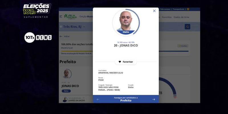 O domingo, dia 5 de outubro, foi atípico para os moradores Três Rios. Foi realizada a primeira eleição suplementar para prefeito da história do município com cinco chapas concorrendo ao pleito. O resultado oficial veio às 19:33 e consagrou o candidato Jonas Dico (Podemos), atual prefeito interino, como prefeito eleito com 40,19% dos votos válidos.