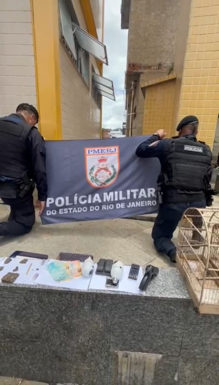 Diante das informações, policiais foram ao local e localizaram alguns tabletes de maconha, munições de calibres 9mm e .380, um simulacro de arma de fogo, bastão com pregos, materiais utilizados para endolação, celulares, roupas camufladas, uma touca ninja e seis aves silvestres mantidas em cativeiro sem autorização do órgão ambiental competente.