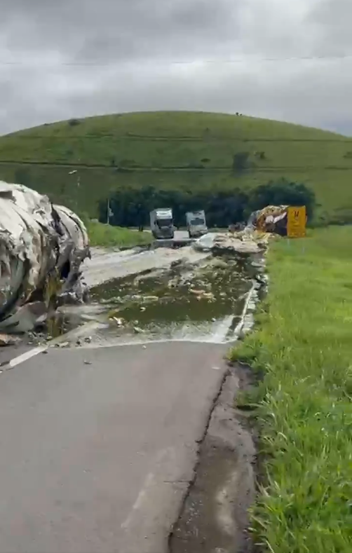 Um acidente envolvendo duas carretas e um carro matou uma mulher de 41 anos e deixou duas pessoas feridas na manhã desta quinta-feira (5), na BR-393, no km 162, em Três Rios. Uma das carretas transportava manteiga de cacau.