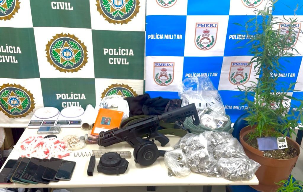 Entre o material apreendido estão dois carregadores “goiabada” de pistola 9mm, capacidade 50 disparos cada, um carregador de acrílico de Glock 9mm, capacidade 31 disparos, um kit roni (conversor projetado para transformar pistolas de airsoft em plataformas mais robustas e versáteis de tiro), 363 tiras de maconha, 103 pedras de crack, 156 pinos de cocaína, dois pés de maconha, quatro balanças de precisão, sete aparelhos de celular, nove munições de cal .38 e uma cal .22, 5 toucas ninjas, R$ 202,35.