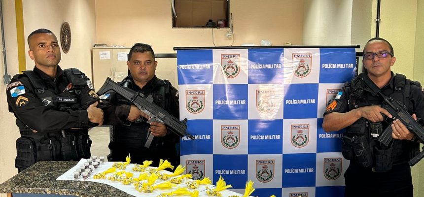 Os policiais notaram movimentação suspeita e realizaram uma varredura na área, encontrando uma sacola plástica com os entorpecentes.