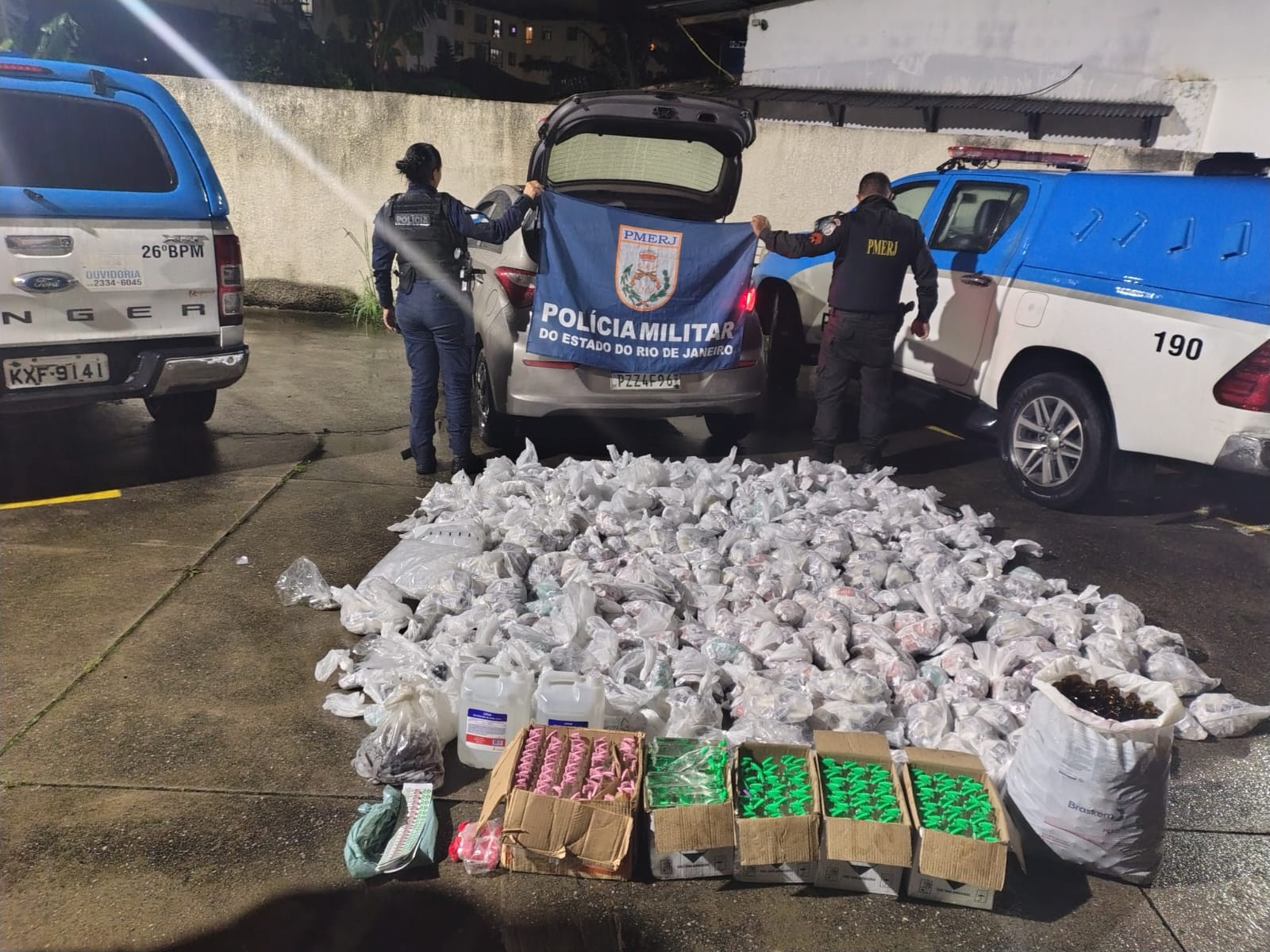 Foram apreendidos 22.074 pinos de cocaína, 10.685 pedras de crack, 660 tabletes de maconha, 1kg adicional de maconha, 334 frascos de lança perfume, 10 litros de loló, quatro trouxinhas de skank material para endolação de drogas, totalizando 93,693 kg de entorpecentes.